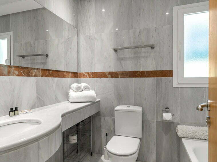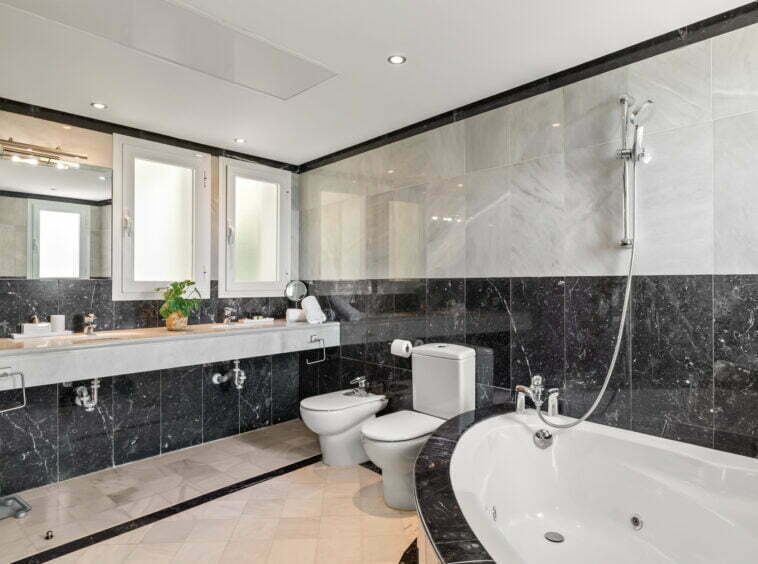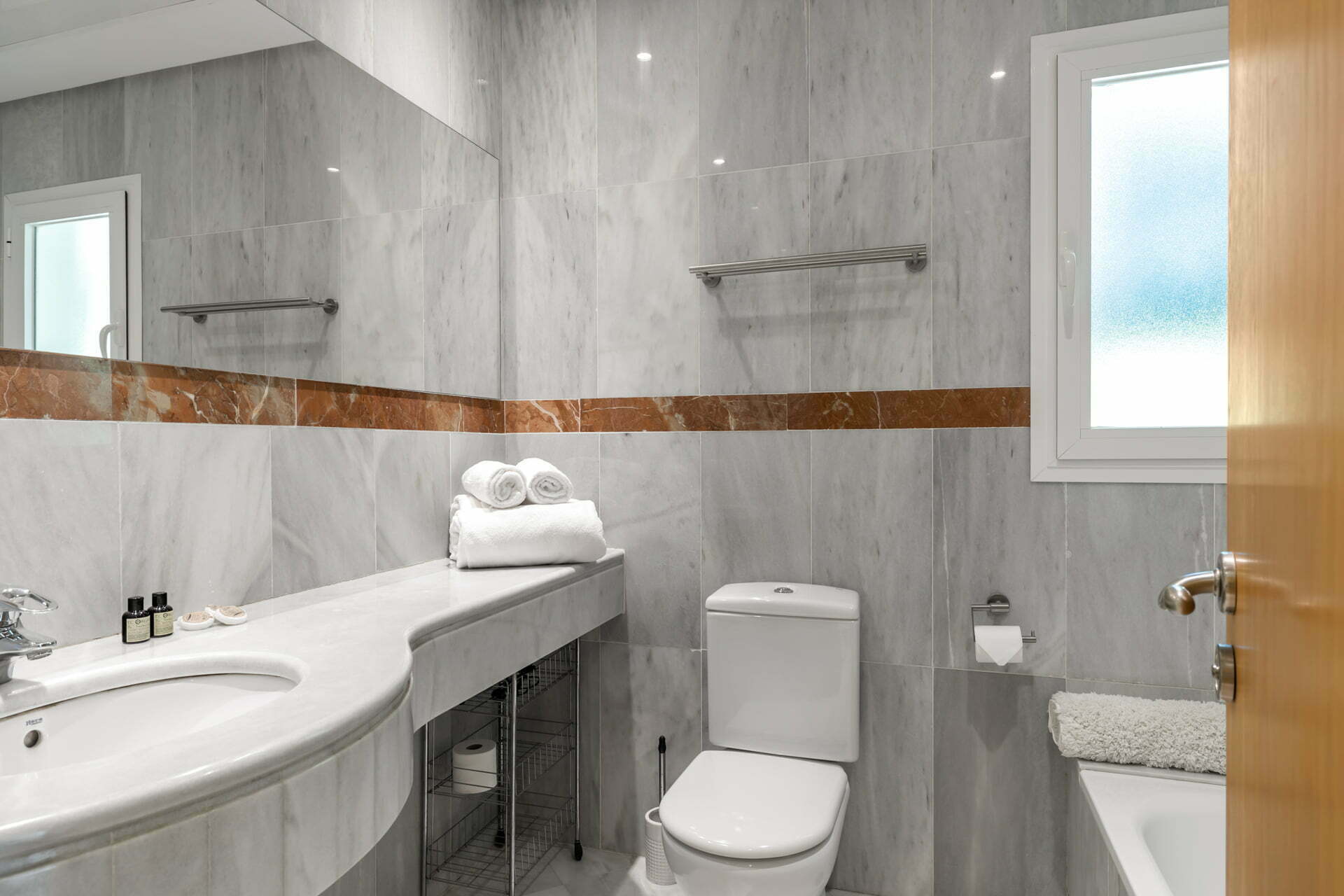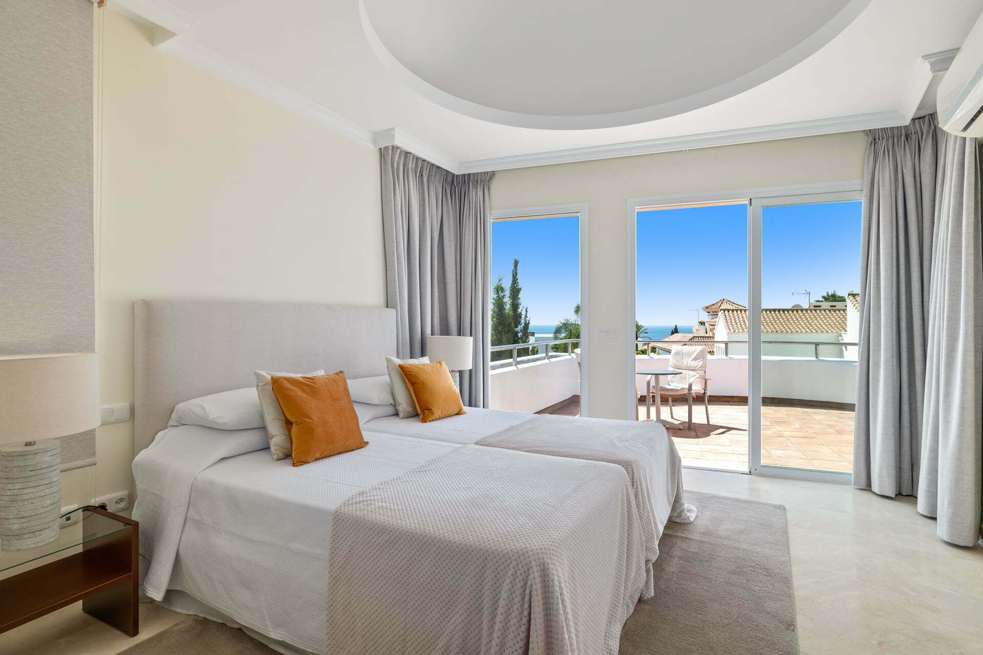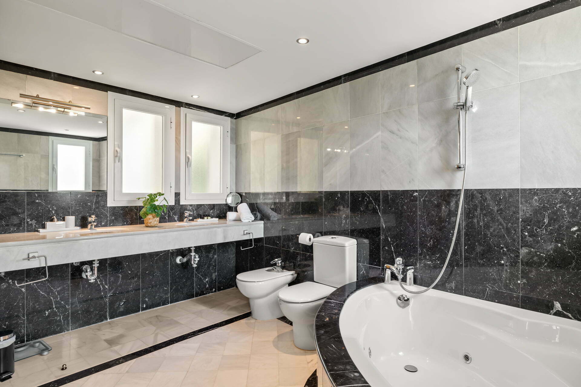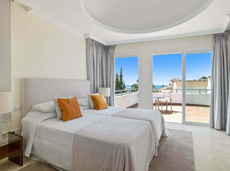 En la planta alta se encuentra la suite principal con terraza privada y vistas al mar. Baño en suite de elegante mármol negro con bañera hidromasaje y plato de ducha; una zona de vestidor con grandes armarios y varias ventanas para que no falte ni un rayo de luz.